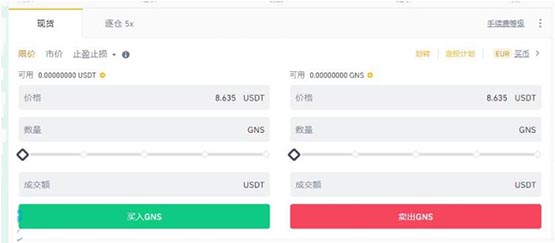 确认交易对为GNS/USDT后,输入购买数量点击买入。