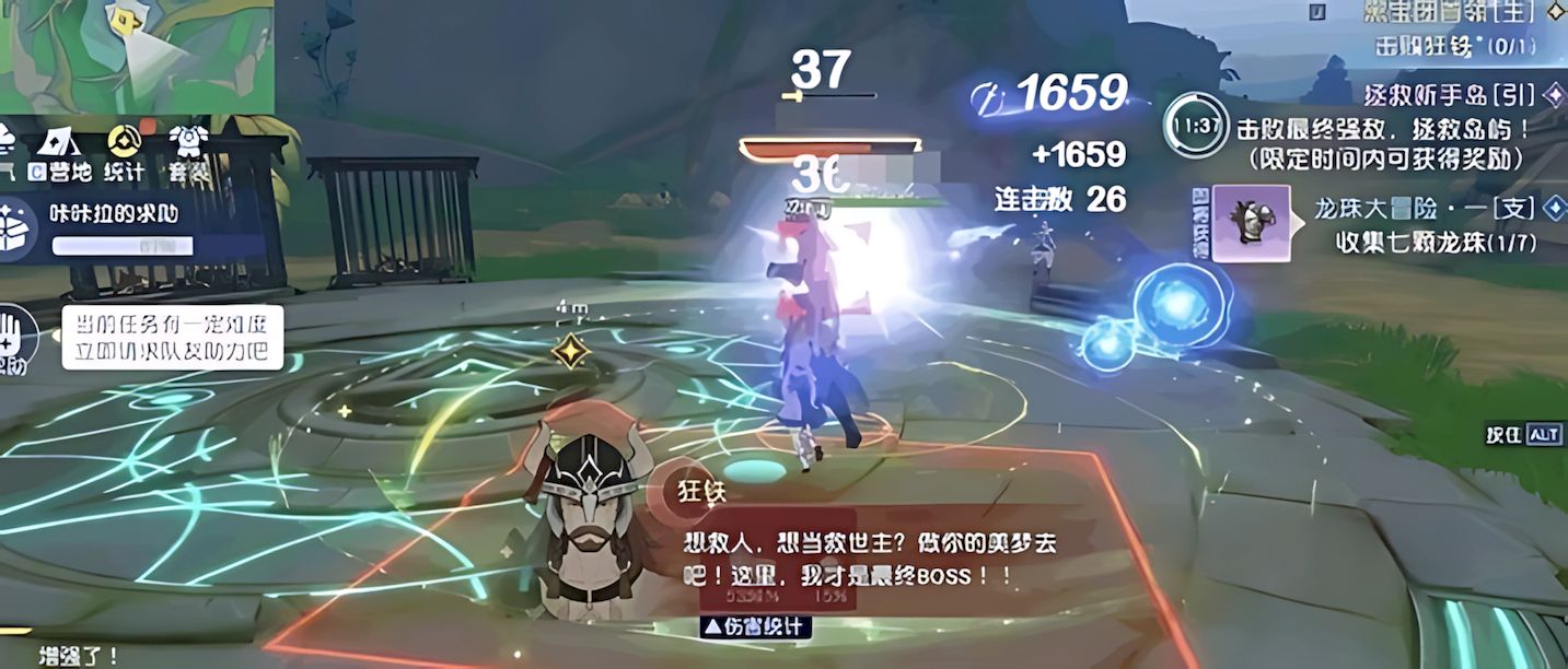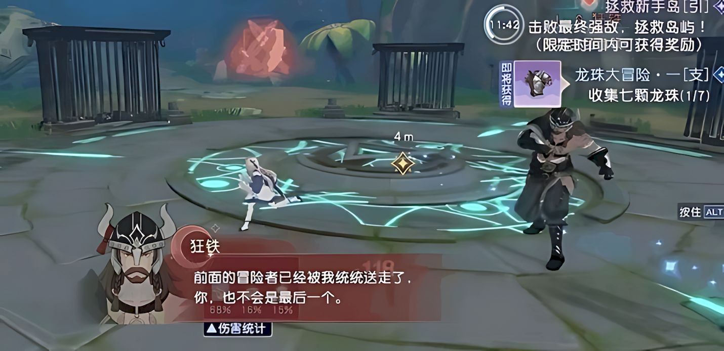 5、可将狂铁吸引至夜刃等NPC附近,NPC会自动攻击吸引仇恨,玩家可安心输出,留意血量较低时它会释放范围大招,需提前躲避规避。