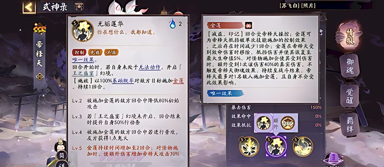 1、核心技能无垢莲华消耗两火,开启幻境并给敌方上金莲,控式神降攻回火,对怪物增伤,该效果持续两回合且受命中属性影响。