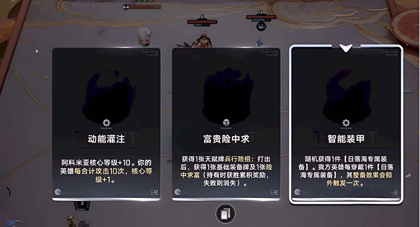 2、前期优先选用姬小满亚瑟过渡,两位英雄不太吃属性等级,提升阶段尽量选取带日落海词条buff牌,推荐智能装甲buff,穿戴防御装备抵御对面连环攻击。