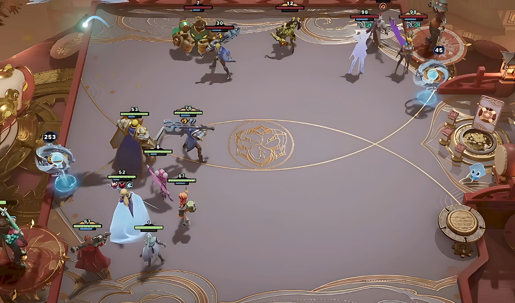 3、后续回合解锁阵容全部核心角色,此时等级不足陷入劣势属于常态,该阶段核心任务锁定防守,稳住自身血量,为后续发育和等级提升争取时间。