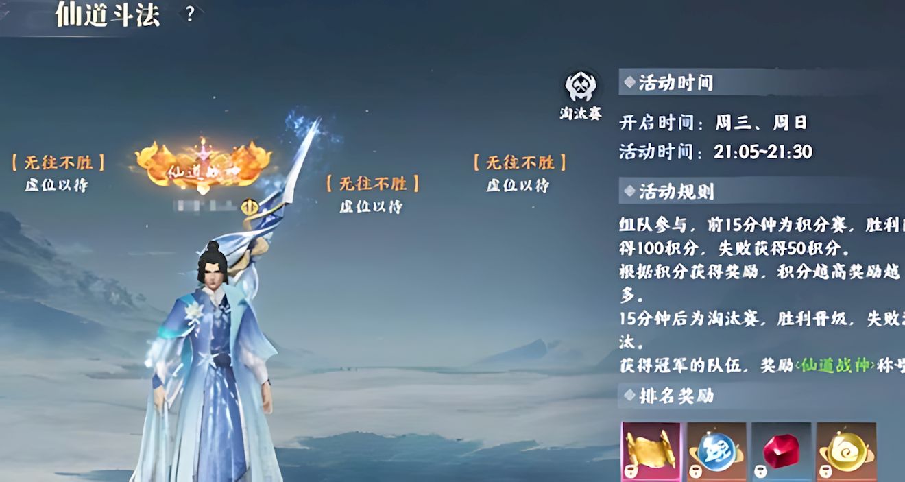 3、仙道斗法每周三周晚上日9点5分到9点30分开启,组队参与先积分赛后淘汰赛,积分规则与巅峰对决一致,依赖队友职业搭配与技能衔接默契配合。