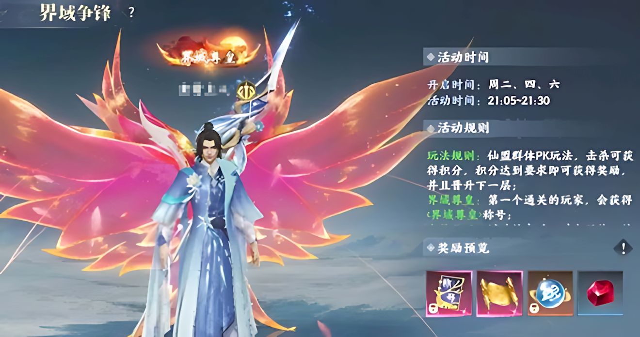 4、界域争锋每周二四六晚上9点5分到9点30分开启,以仙盟为单位群体PK,击杀对手积累积分,达标获奖励并晋升,首个通关者获界城尊皇称号。