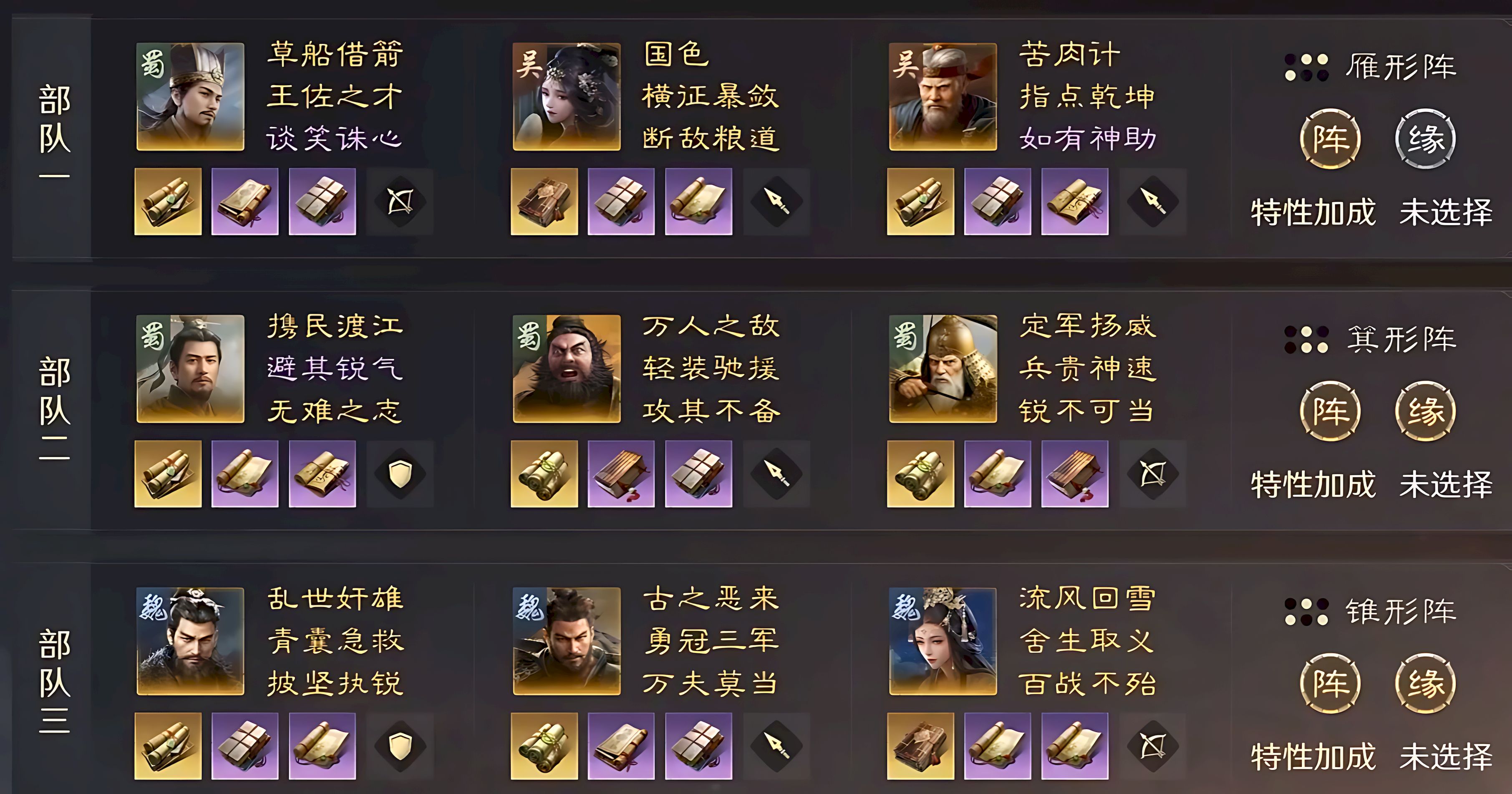 3、战队确定战斗时间后等待匹配,匹配成功进入预配队,三位武将会获得随机强化,可自主搭配形成专属阵容。