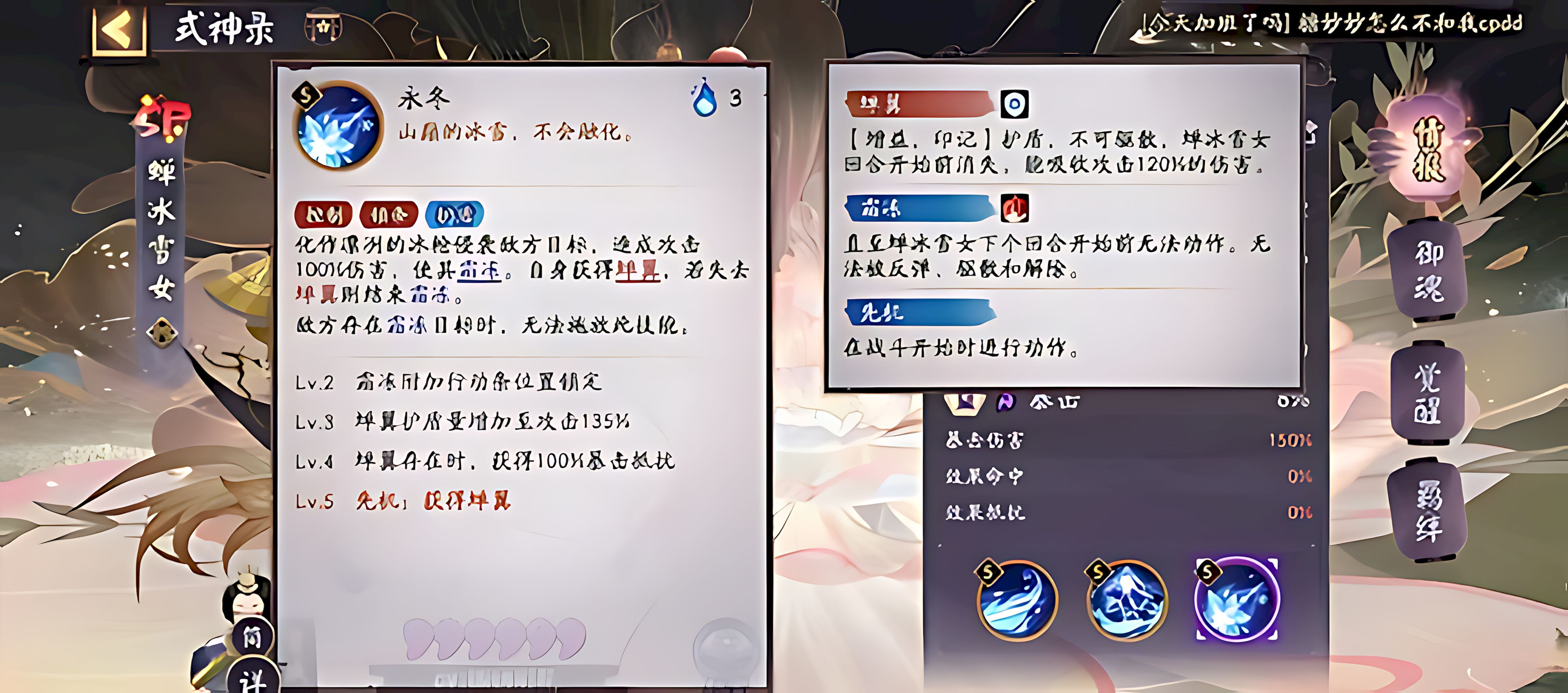 4、技能升级有额外增益,二技能对霜冻敌方增伤50%,三技能护盾量提升且获暴击抵抗,五级时可先机获得蝉翼护盾。