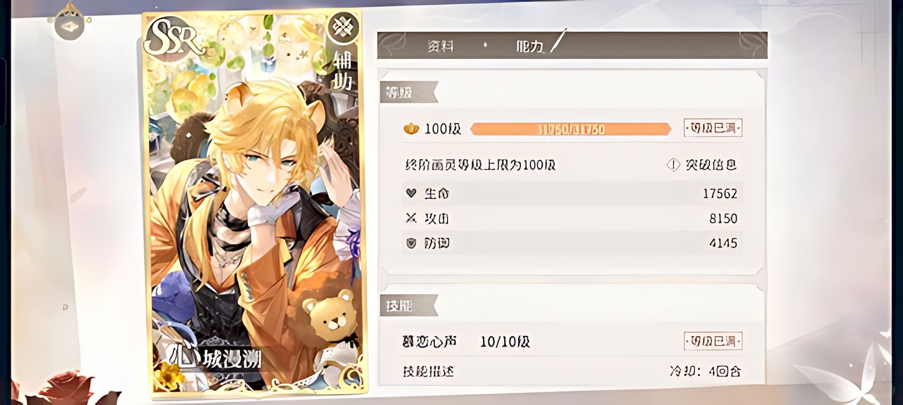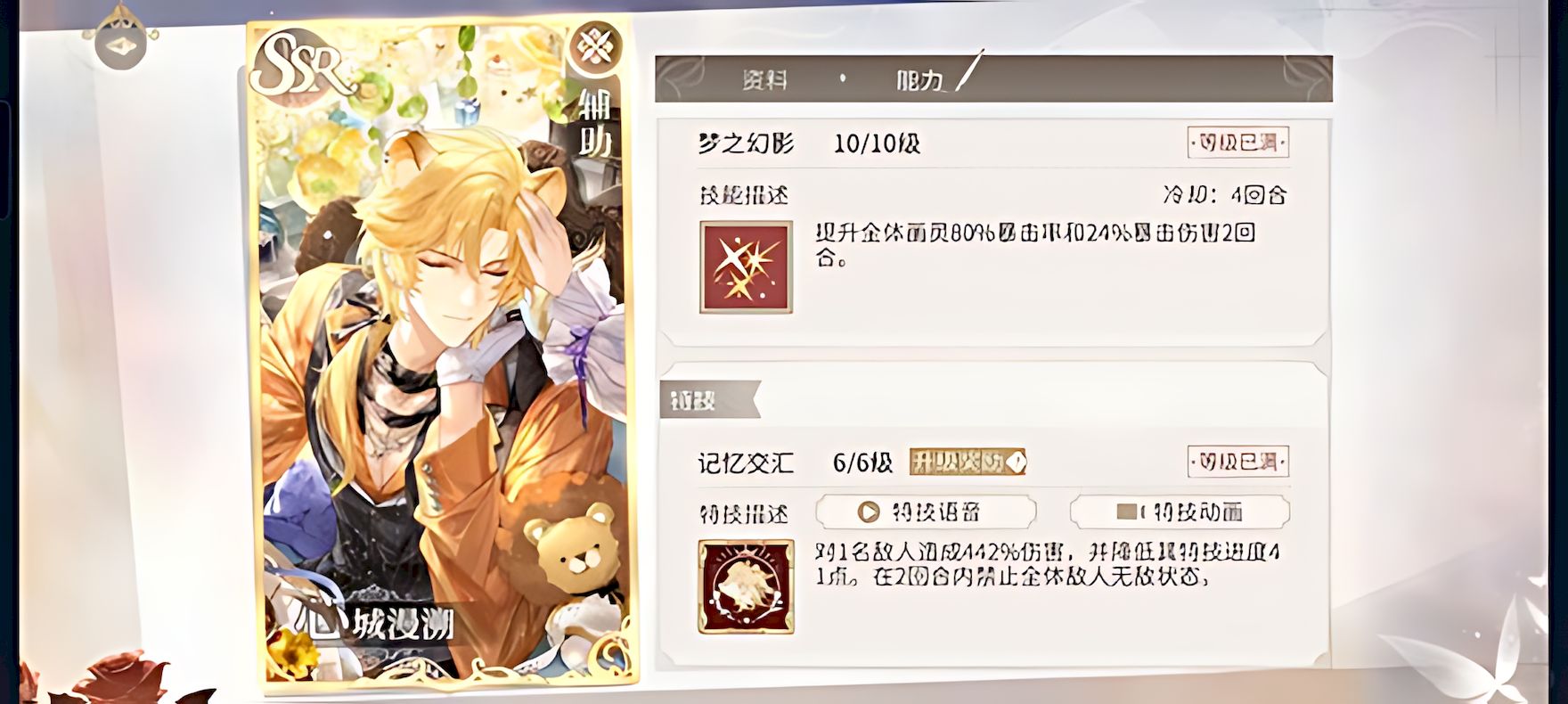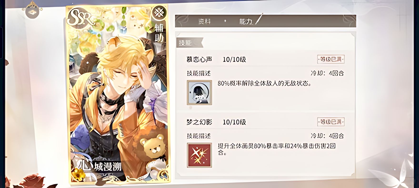 3、一技能慕恋心声冷却四回合,80%概率解除全体敌人无敌状态,低特阶段主要依靠该技能发挥作用。
