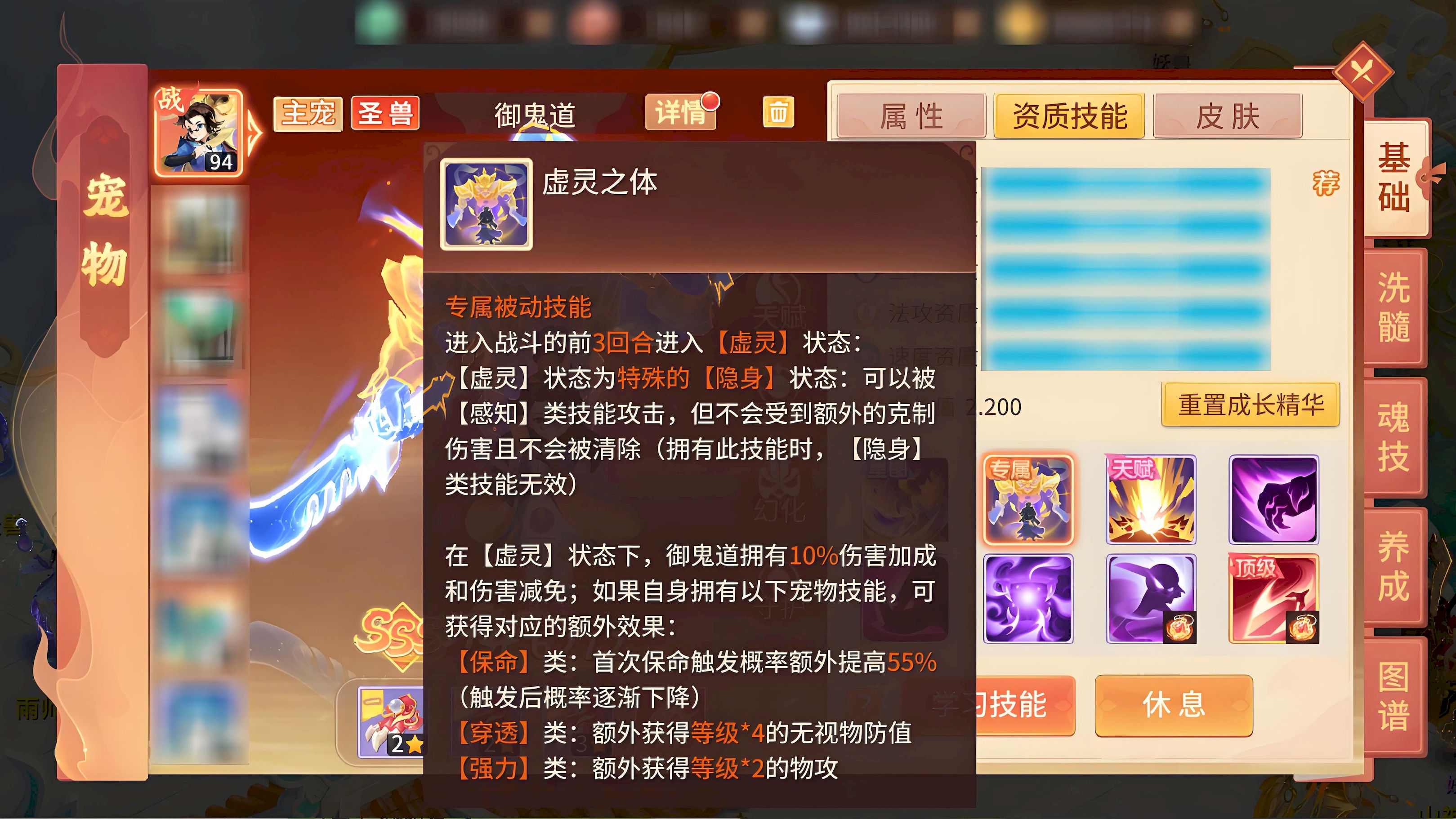 2、虚灵状态下御鬼道拥有10%伤害加成和减免,带保命类技能首次触发概率额外提55%,带穿透类获等级乘4无视物防值,带强力类获等级乘2物攻。