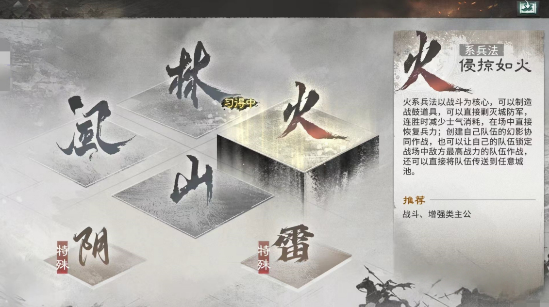 2、火系以战斗为核心,能做战鼓剿灭城防军,召唤幻影作战,锁定高战斩首,适合热衷战斗攻坚的玩家选择。