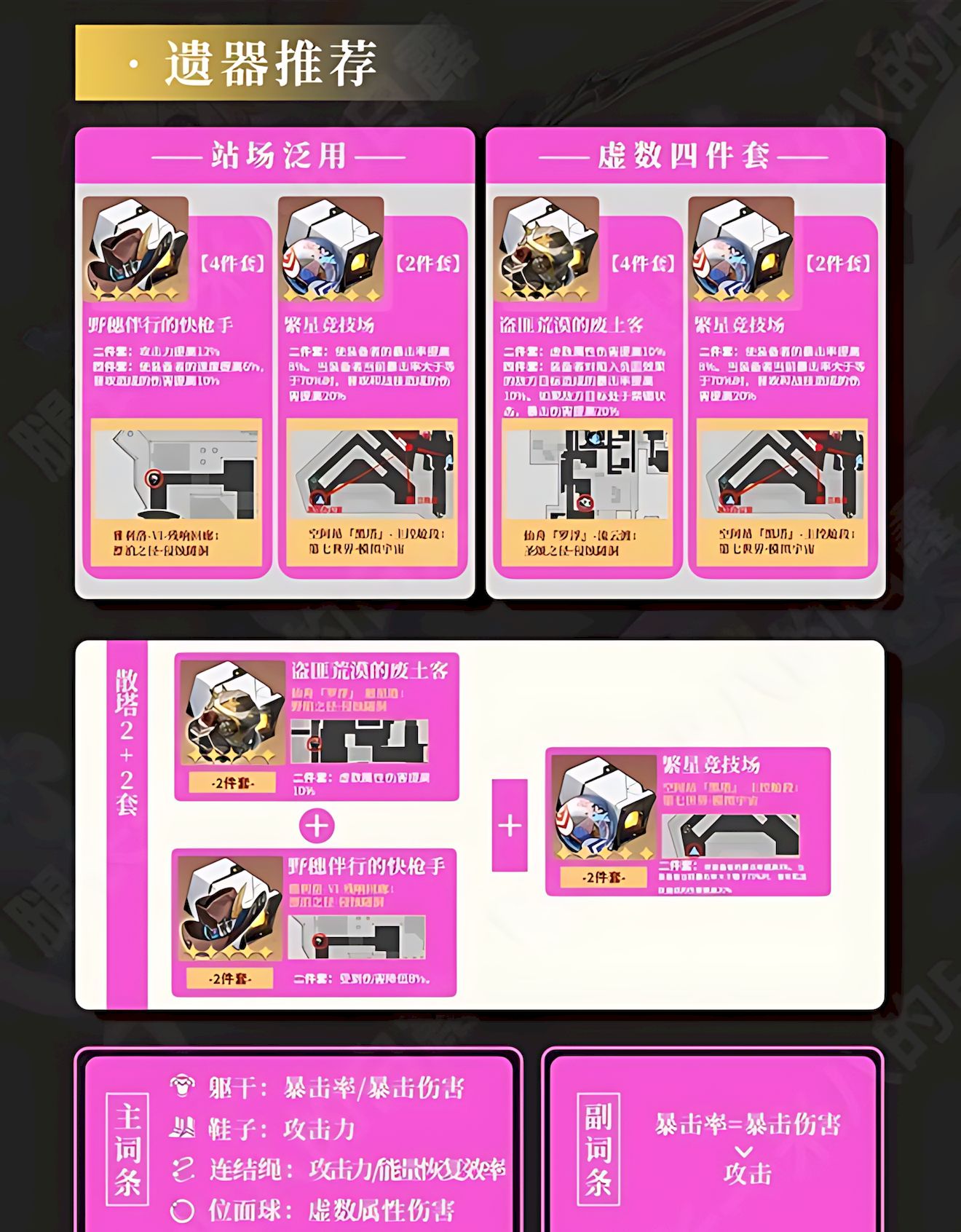 3、遗器推荐快枪手四件套加繁星二件套,或废土客四件套搭配,也可混搭套装,重点堆输出相关属性。