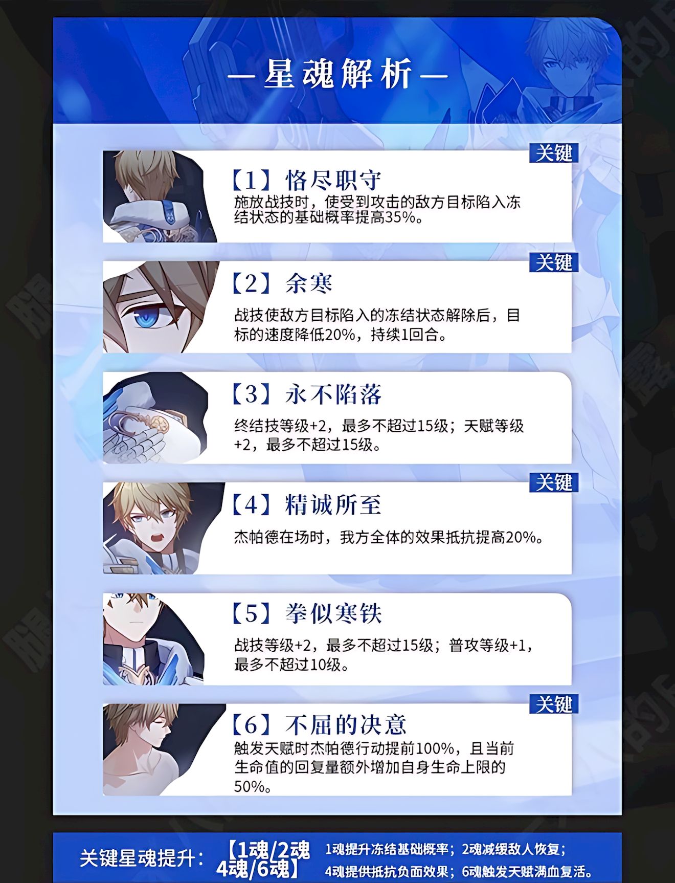 3、关键星魂提升效果显著,一魂提高冻结基础概率,二魂减缓敌人恢复速度,四魂提供负面效果抵抗,六魂触发天赋复活。