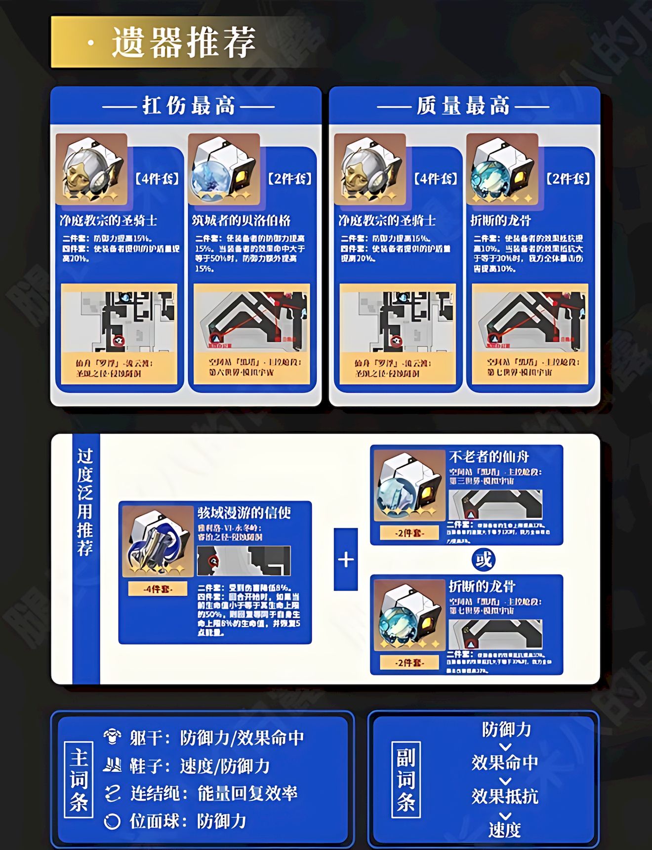 4、遗器首选净庭教宗的圣骑士套装,二件套提升15%防御力,四件套使装备者提供的护盾量提高20%,契合培养需求。