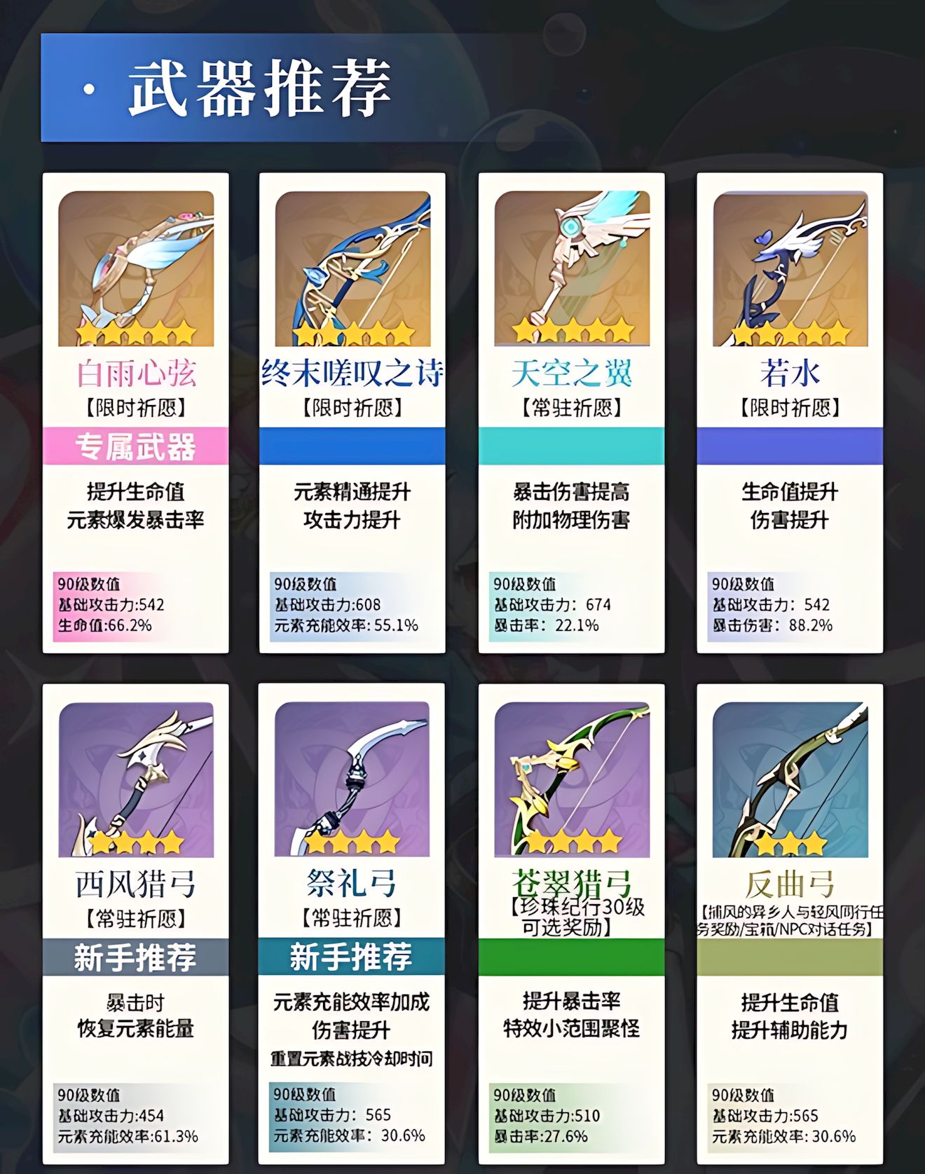 2、武器选择五星首选白雨心弦专武,次选终末嗟叹之诗天空之翼若水,四星可择西风猎弓祭礼弓苍翠猎弓反曲弓。