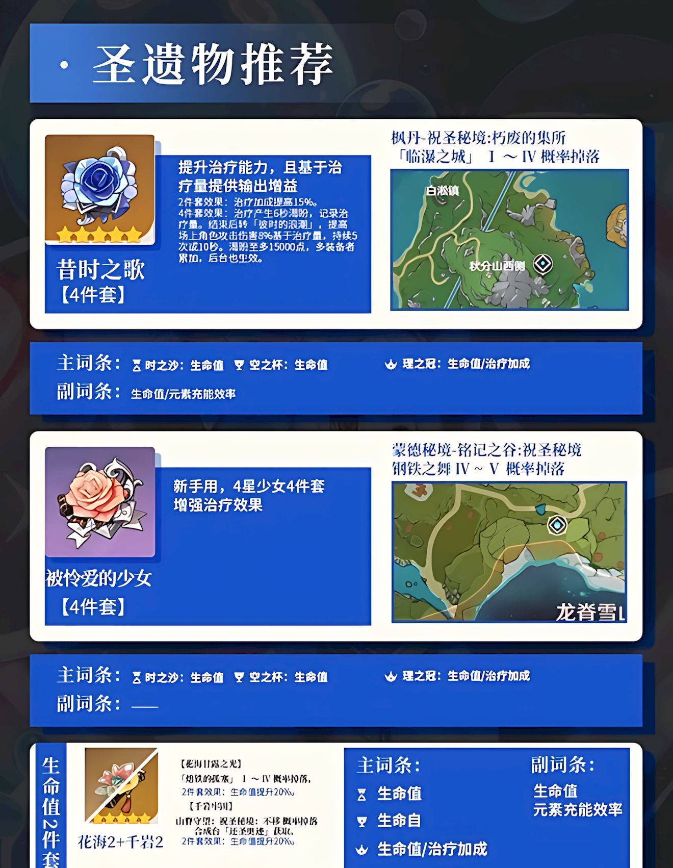 3、圣遗物可选昔时之歌少女套或花海二加千岩二,主词条选生命沙生命杯生命或治疗加成头副词条堆生命值。