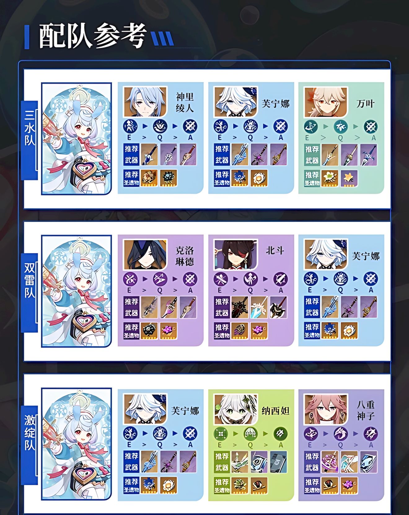 4、配队可组三水队双雷队激绽队,核心搭配希格雯与芙宁娜,再结合绫人万叶或克洛琳德北斗或纳西妲神子。
