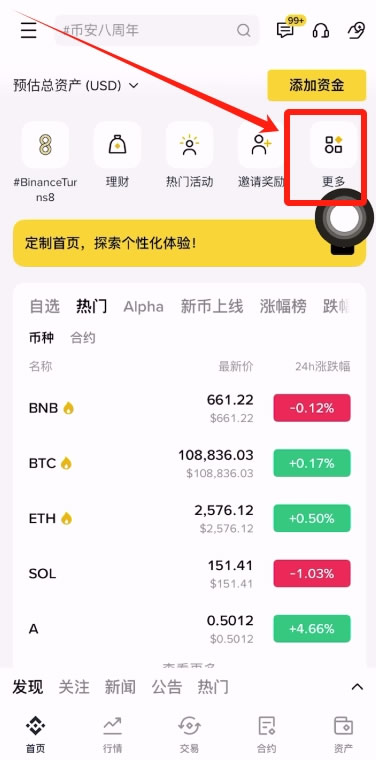 1、注册完成之后,打开币安app的首页,点击这里的【更多】。