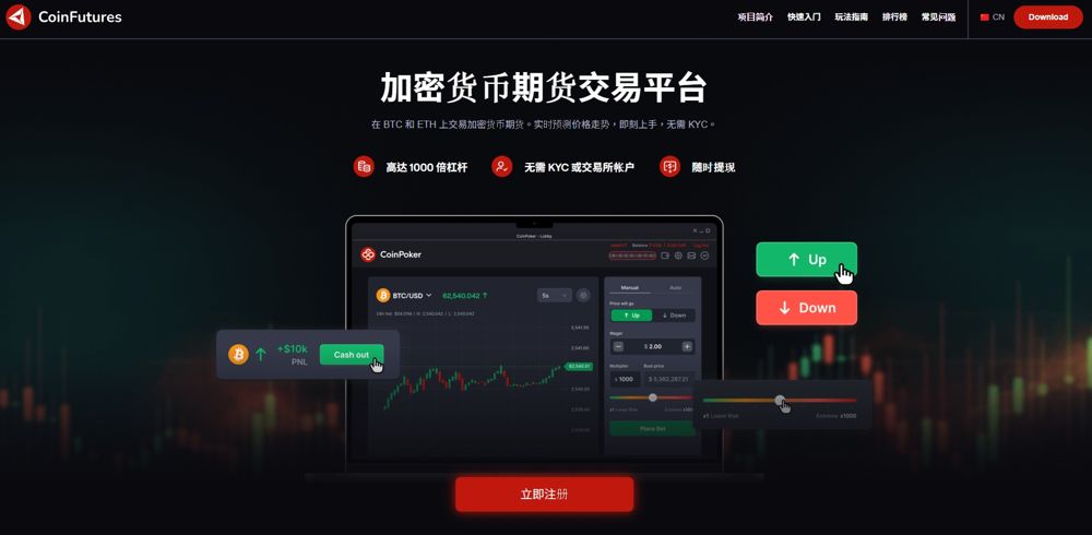 CoinFutures以独特的预测交易模式脱颖而出,支持BTC、ETH等7种主流币种短期走势判断。平台采用无实体持仓算法,用户仅需预测涨跌方向并设置1000倍杠杆即可参与,规避传统期货的强平风险。