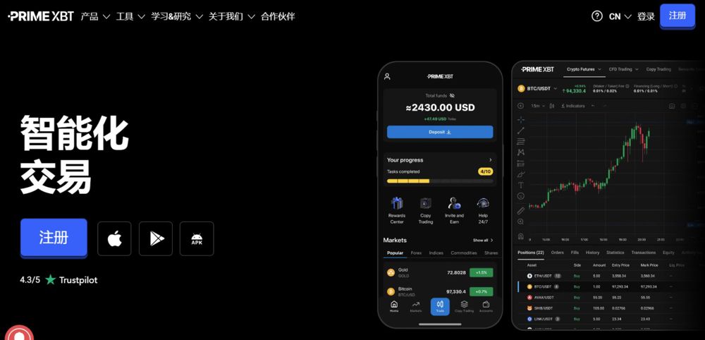 PrimeXBT提供200倍杠杆与低至0.01%的做市商费率,支持加密货币、外汇、商品等多类资产。特色功能包括复制交易与免KYC账户,最低1美元即可入场。