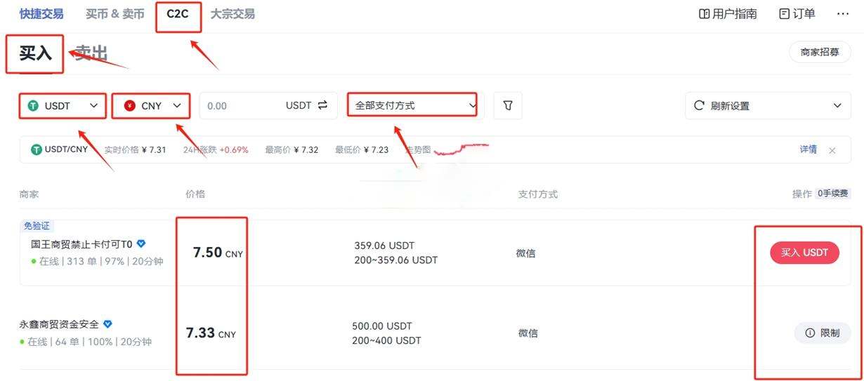 4、通过C2C通道购买USDT,为后续交易做好准备。