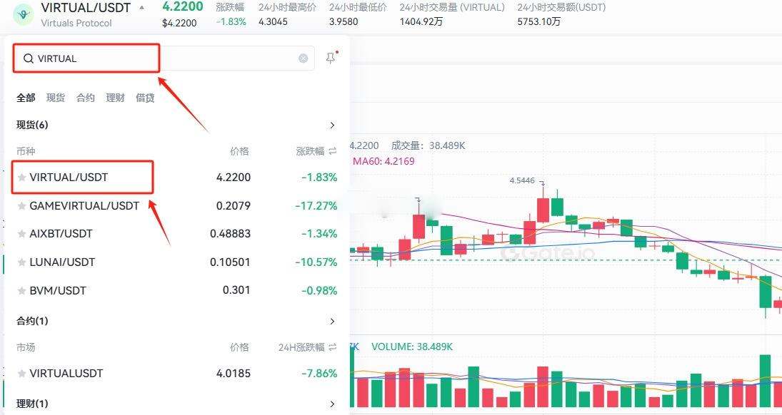 5、转入现货交易页面,搜索VIRTUAL/USDT交易对。