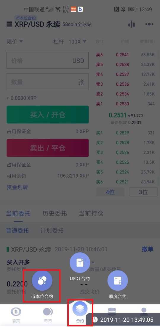 创建仓位前需确保账户有足额资金。通过"我的-转账"功能将其他账户资产转入合约账户,系统支持XRP等主流币种免费内部转账。