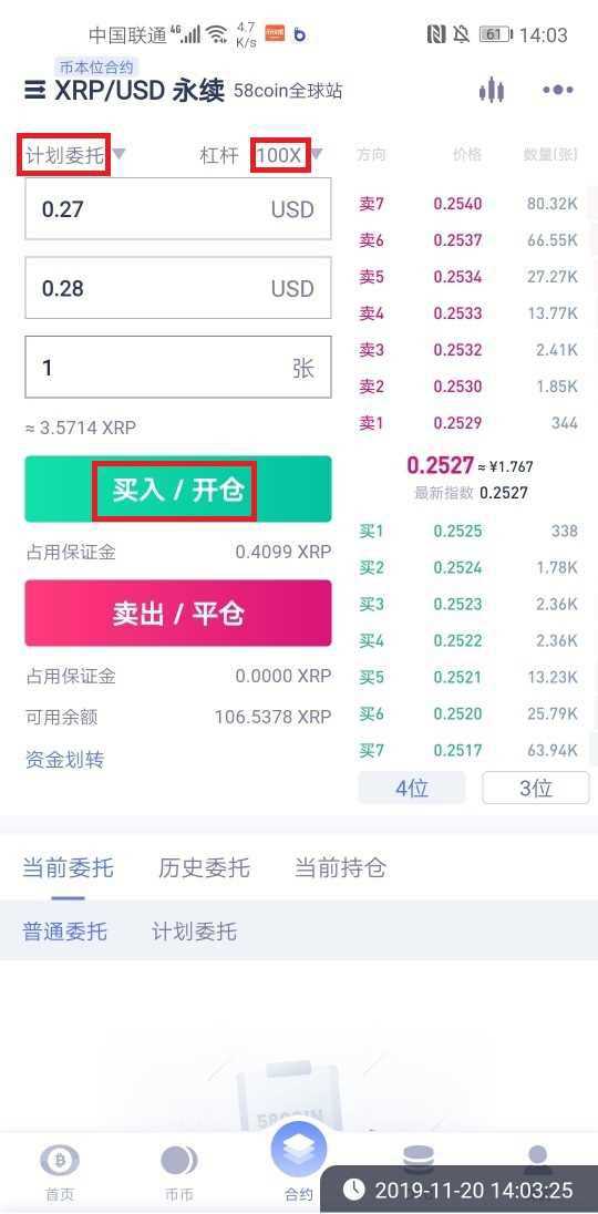 进入"合约-币本位合约"界面后,可选择限价、市价或计划委托三种开仓方式。以XRP/USD永续合约为例,设置杠杆倍数、价格及数量后即可提交委托。