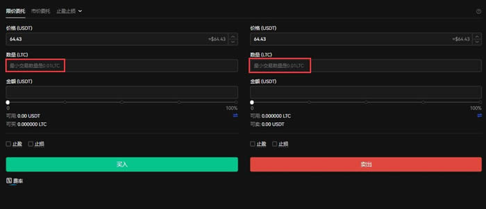 进入市场页面搜索目标币种(如LTC),点击交易按钮进入订单界面。输入购买数量后确认买入,卖出操作同理。