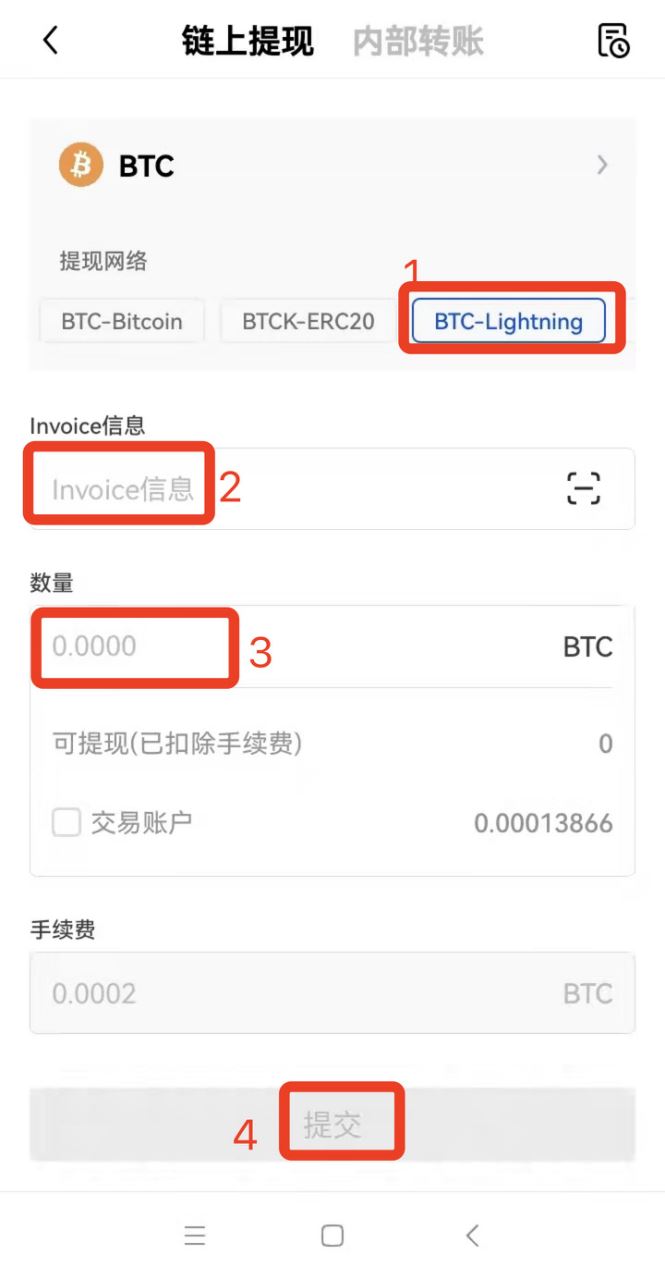 2.选择【BTC-Lightning】网络,粘贴收款方Invoice信息并确认手续费后提交
