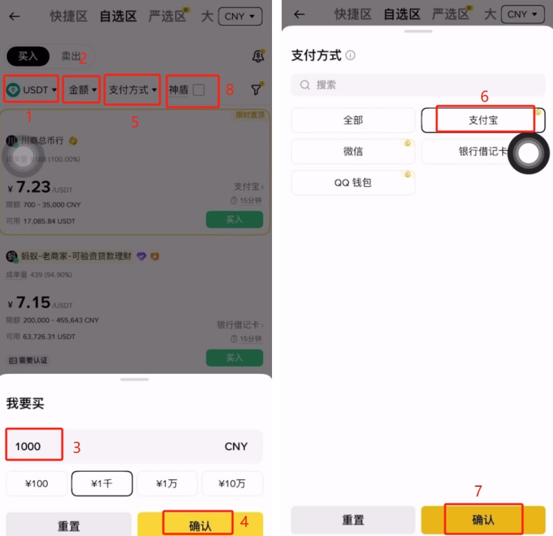 第三步:设定购买金额并选择支付宝作为支付方式,建议优先选择带有神盾标识的认证商家。