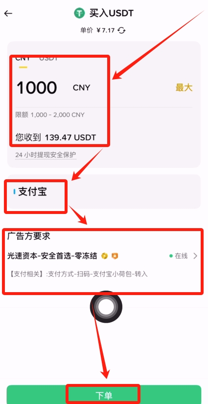 第五步:确认订单金额与到账数量,通过支付宝完成转账后需上传付款凭证,等待商家放币。
