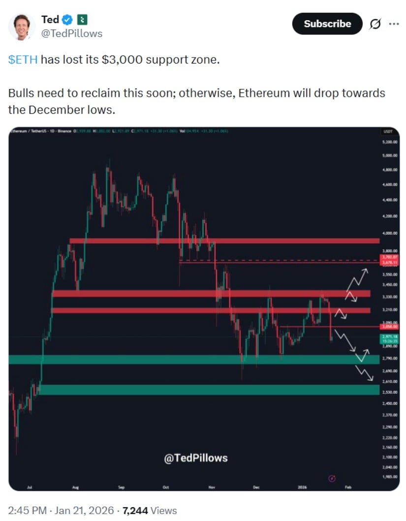 以太坊已跌破3000美元支撑位,若多头未能收复该区域,价格恐将滑向12月低点。来源:@TedPillows via X
