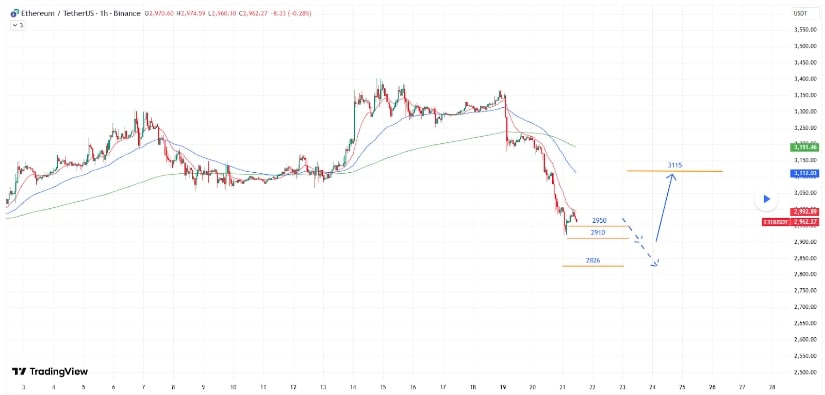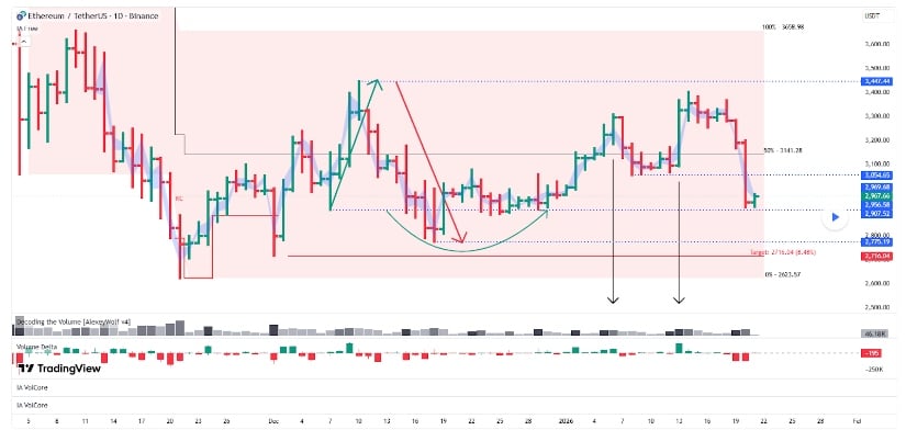 以太坊连续下跌,分析指出短期回调是更可能情景,但2950美元和2910美元的下行目标仍存可能而非必然。来源:TradingView上的CoinRanger