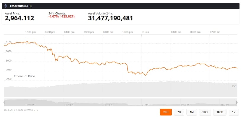 2026年1月21日以太坊价格急剧下跌,最低触及2964美元附近,日内跌幅约7%。此次下跌确认了日线收于3000美元心理支撑位下方,该价位在近期回调中曾发挥稳定作用。此次下跌恰逢现货抛压加剧,且比特币跌破89000美元后引发市场整体疲软。