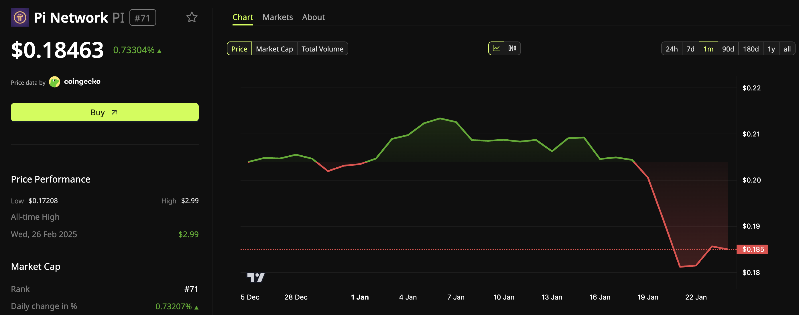 尽管短期回暖,Pi币整体趋势仍呈颓势:过去一个月累计下跌近10%,较2月交易所首发价跌幅超78%。交易量低迷、散户兴趣减弱以及持续代币解锁等因素持续压制市场情绪。