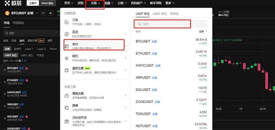 1、访问欧易平台(官方注册 官方下载),进入交易界面选择合约交易,确定交易币种如BTC。