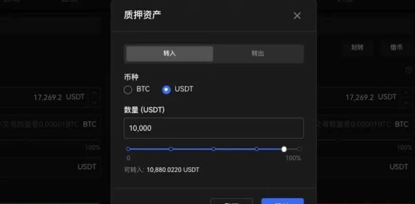 4、输入从资金账户转入一键借币账户的金额作为交易质押,例如划转10,000 USDT后确认。