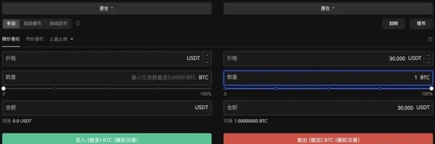 7、当BTC价格上涨至30,000 USDT时,输入价格和数量选择卖出做空完成平仓。