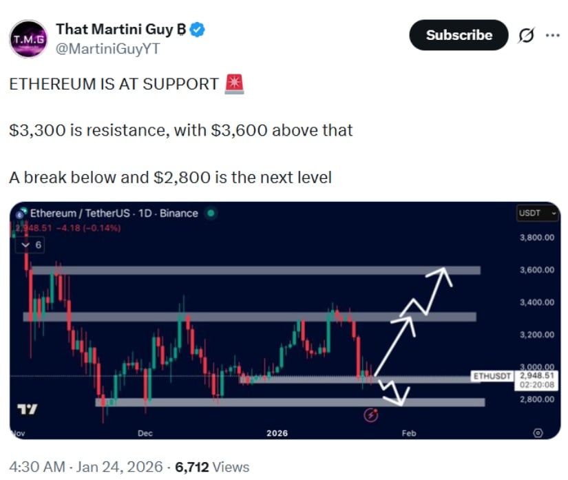 以太坊正在测试关键支撑,3,300-3,600美元构成阻力区间,若支撑失守则下行目标看2,800美元。来源:X@MartiniGuyYT