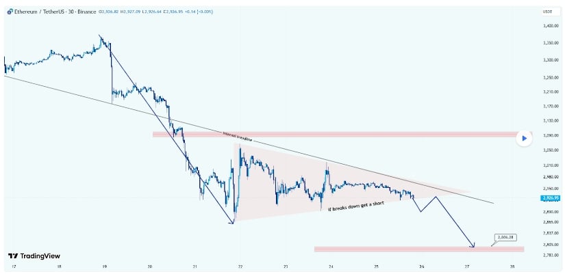 从图表分析来看,以太坊技术面呈现下降三角形形态。该结构形成于看跌脉冲之后,价格被压制在作为动态阻力的下降趋势线与2,800美元水平支撑位之间。
