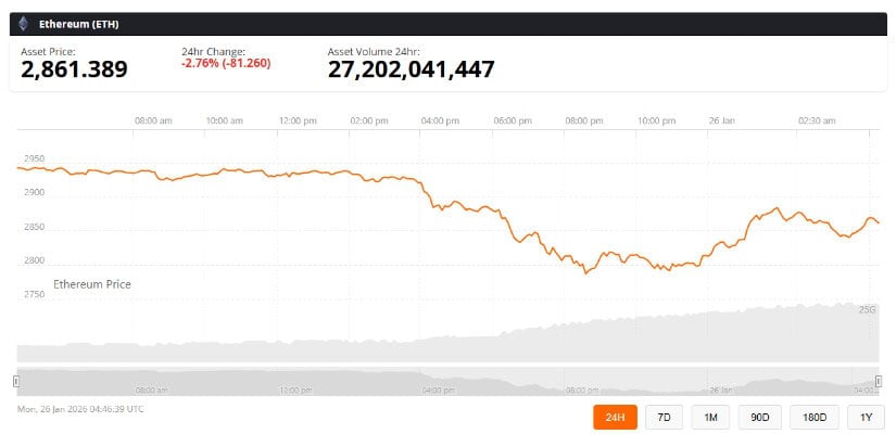 截至1月26日,以太坊现价在2,860-2,880美元区间震荡,反映出在未能站稳3,000美元上方且多次遭遇日线级别阻力后的持续盘整。