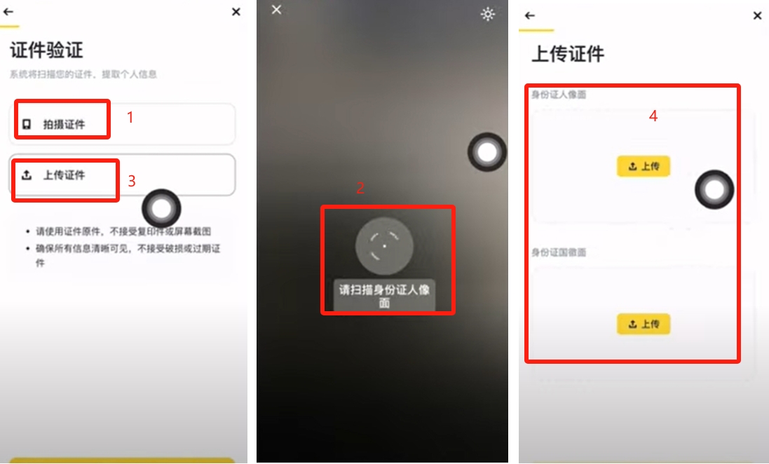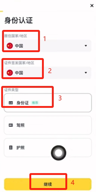 登录APP后进入认证页面,选择中国为居住地和签发国。推荐使用身份 证件,支持拍摄或上传正反面照片,配合人脸识别完成验证流程。