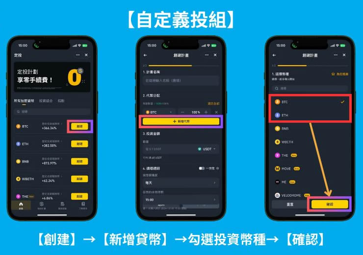 从交易页面进入定投功能,选择创建自定义组合后可自由设定币种比例、投资金额及周期频率。