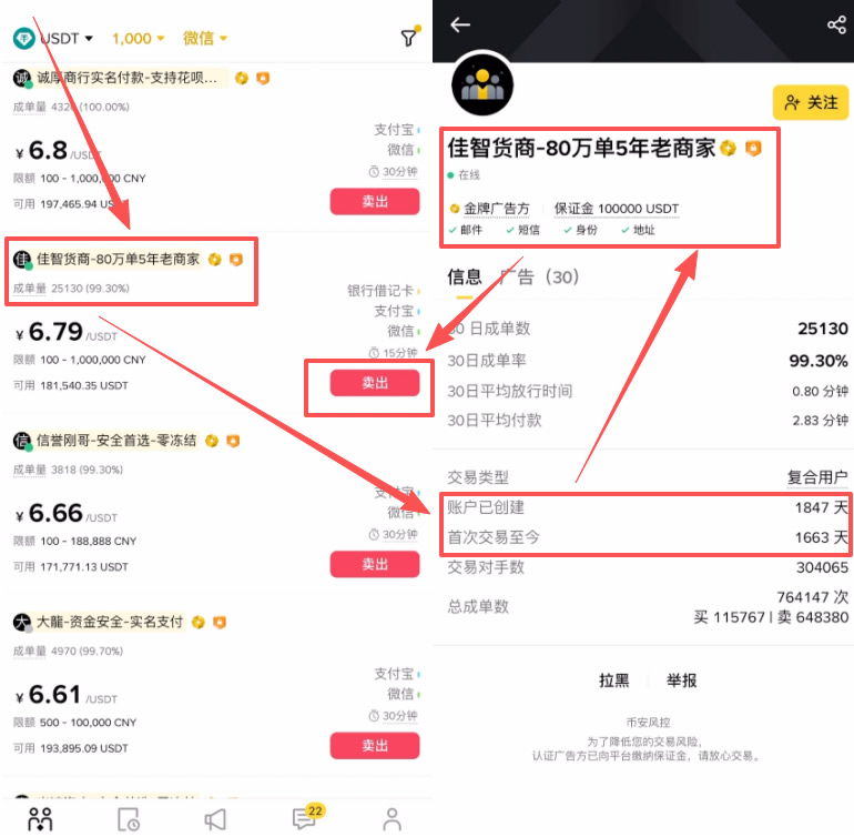 下面就是符合我们条件的商家了,这个时候就需要我们自行去筛选一个比较靠谱的商家去跟他交易。如何筛选呢?首先我们要忽略掉这个报价最高的,也就是6.85的这个商家,因为高价收U是存在一定的风险的,所以我们就可以从6.8或者6.79开始选。看一下他的成单量和成单率都是越高越好。