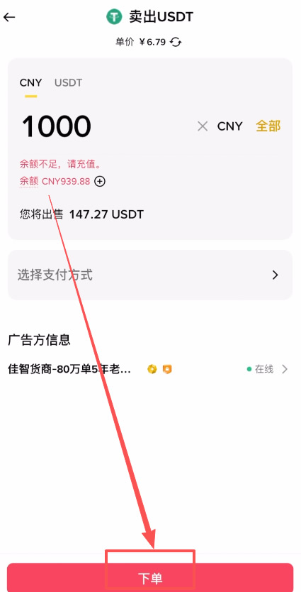 接下来填写上我们要退先的金额,或者是USDT的数量,然后点击下方的“选择支付方式”。