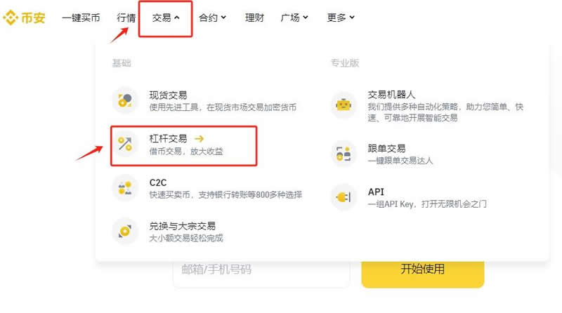 1.访问币安官网(新用户需先完成注册),通过顶部导航栏选择【交易】-【杠杆交易】选项。