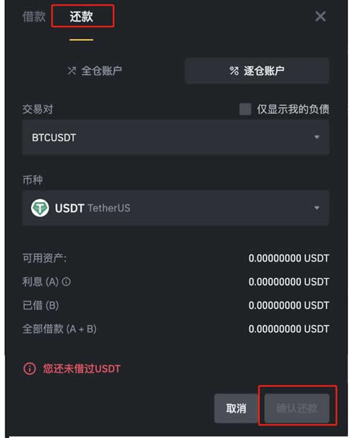 9.在借代界面切换至【还款】标签,选择对应币种和还款金额后完成还款操作。