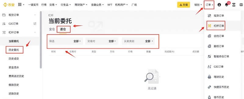 11.在【订单】-【杠杆订单】页面可查询历史交易记录,支持按时间、交易对和买卖类型进行筛选。
