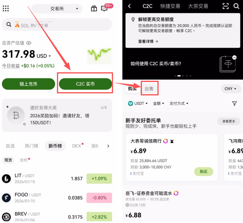 C2C 交易是个人对个人的琺幣交易,欧易作为平台担保,资金安全有保障,新手可放心操作。
