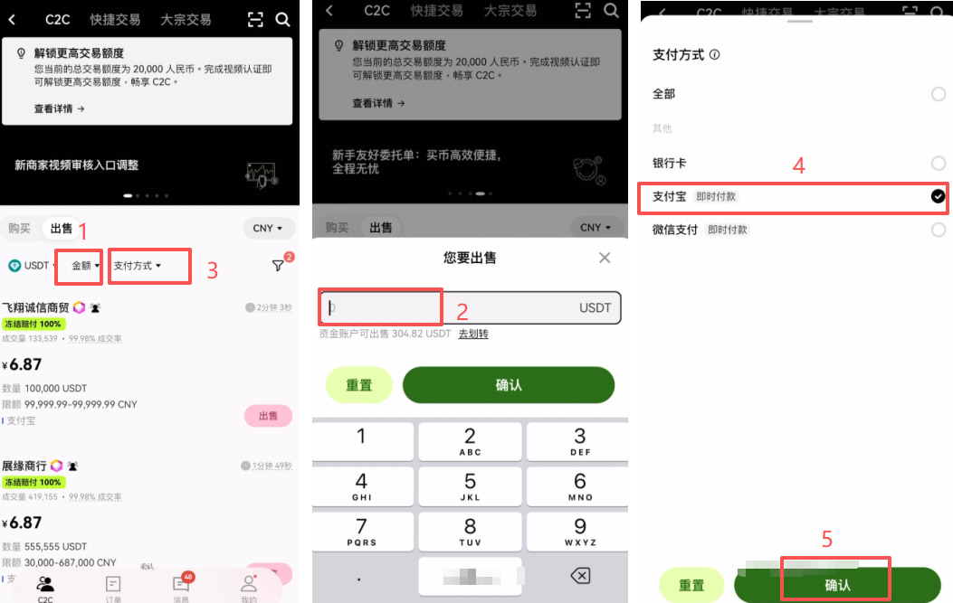 | C2C 卖 USDT | 0(平台免费,商家可能有微小差价) | 1-5 分钟(支付宝 / 微信最快) | 最高 50 万 chy |