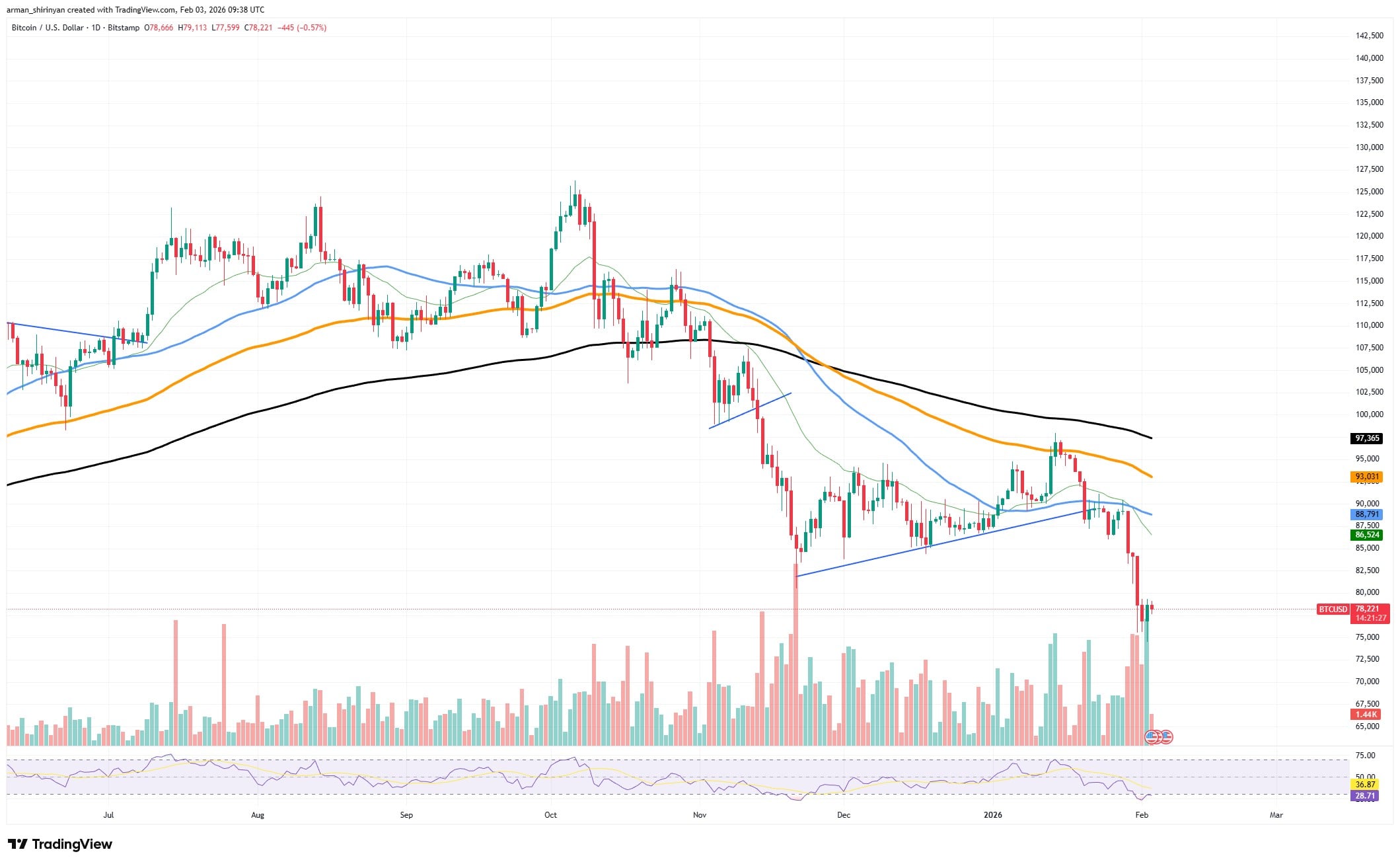 近期跌破8万美元时成交量放大,揭示市场存在恐慌性出逃和强制平仓,而非健康轮换。尽管出现短暂反弹,RSI指标仍显疲软,显示看跌压力持续存在。