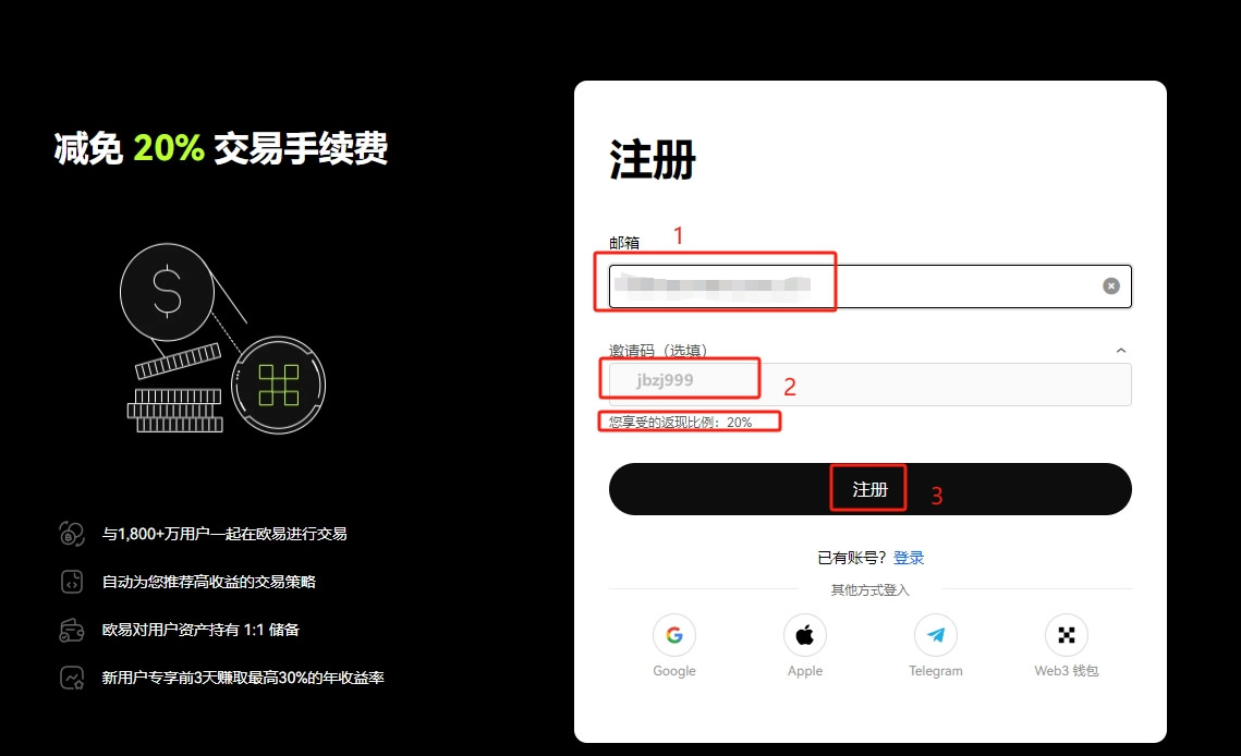 访问欧易官网注册页面,输入常用邮箱地址(支持QQ/163/Gmail等)。注册时系统将自动填充邀请码RYE2025,若未显示需手动输入。点击注册按钮后,依次完成邮箱验证、手机号绑定(+86中国区号)、居住地选择(中国)及密码设置(需包含大小写字母+数字+符号)。